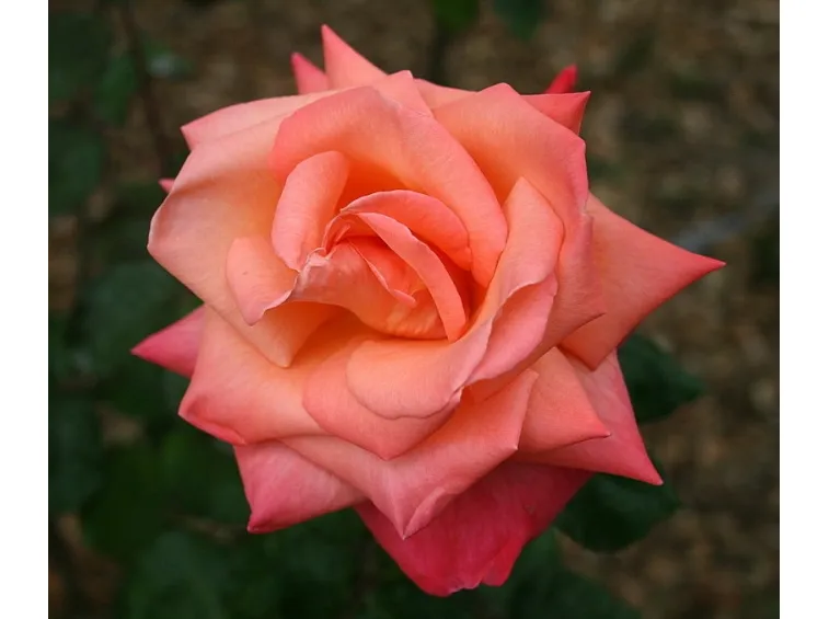 Rosa dai grandi fiori (13 cm di diametro) dalla tinta arancione indiano con sfumature di rosso e delicati accenti di rosa, la corolla esibisce un’equilibrata foggia turbinata di circa 25 petali e gli steli dal portamento eretto esibiscono da uno a tre fiori. Il profumo emanato è leggero mentre il fogliame è verde scuro e brillante.