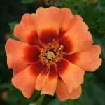 I fiori sono semi-doppi, di color arancio con un occhio centrale rosso, molto impattanti ma quasi senza profumo.