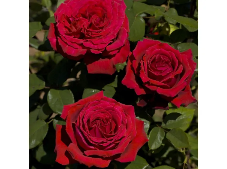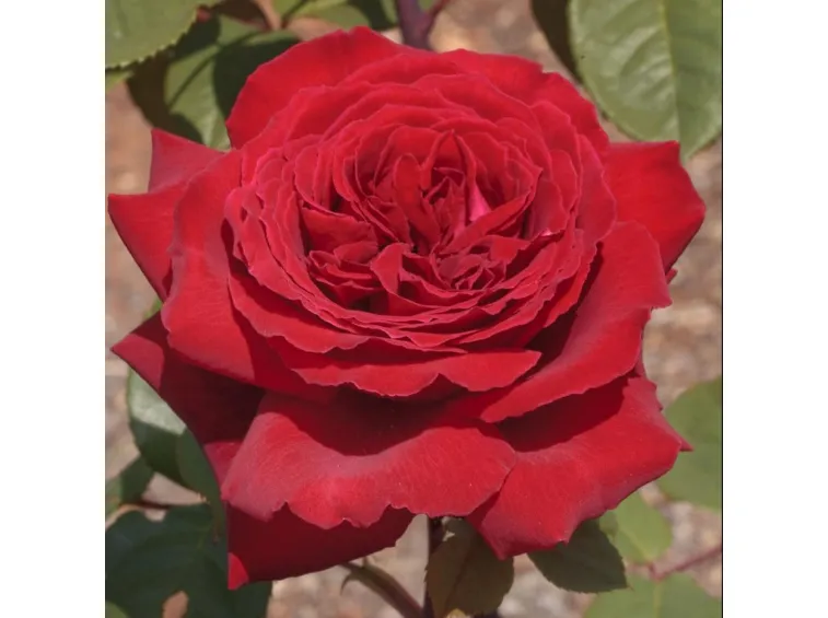 Fiori grandi, molto doppi (90-100 petali) e compatti, a coppa, per circa 13 cm di diametro, caratterizzati da un colore rosso molto acceso e dalla intensa fragranza.