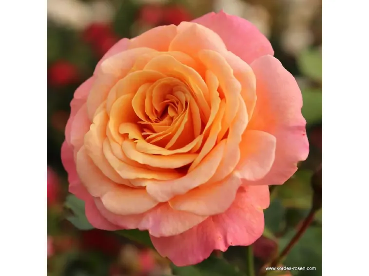 Fiore molto doppio, a coppa, dal diametro di 8 cm composto da petali arancio albicocca a sfumatura rosa dal profumo gradevole, fruttato ma delicato.